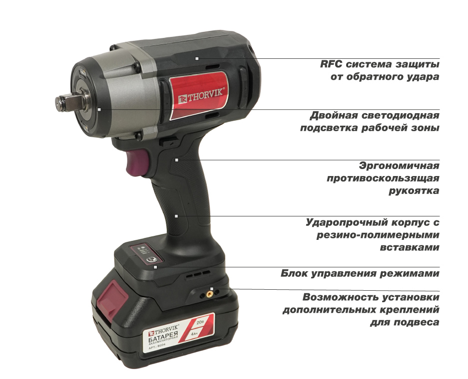 Аккумуляторные гайковерты Thorvik применяются для проведения слесарно-монтажных работ, связанных с обслуживанием резьбовых соединений в мастерских, цехах и производственных помещениях, персоналом, имеющему соответствующую квалификацию и навыки работы с электроинструментом, знакомым с правилами техники безопасности, условиями эксплуатации. Ударопрочная рукоятка с полимерными бензомаслостойкими вставками. Блок управления скоростями и автостопом со световой индикацией. Аккумуляторная батарея с индикацией заряда.