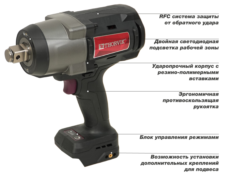 Аккумуляторные гайковерты Thorvik применяются для проведения слесарно-монтажных работ, связанных с обслуживанием резьбовых соединений в мастерских, цехах и производственных помещениях, персоналом, имеющему соответствующую квалификацию и навыки работы с электроинструментом, знакомым с правилами техники безопасности, условиями эксплуатации. Ударопрочная рукоятка с полимерными бензомаслостойкими вставками. Блок управления скоростями и автостопом со световой индикацией. Аккумуляторная батарея с индикацией заряда.