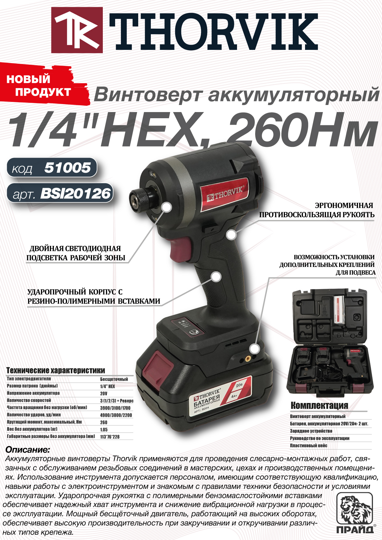 BSI20126 Винтоверт аккумуляторный, 20В, 260 Нм Thorvik
