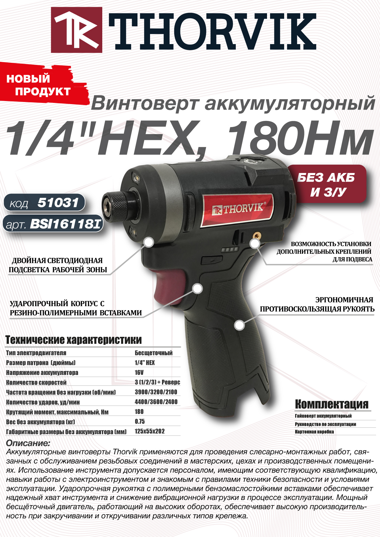 BSI16118I Винтоверт аккумуляторный, 16В, 180 Нм, (без АКБ и З/У) Thorvik